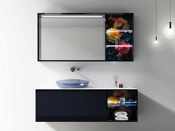 - 智能鏡柜功能:柜體藏藍(lán)免漆板,背板 PU 二分光藏藍(lán)油漆